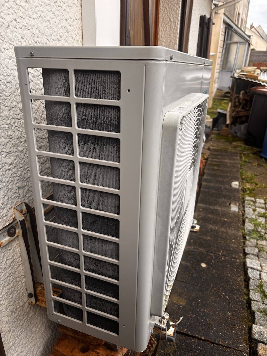 Le technicien inspecte également le groupe extérieur, souvent exposé aux intempéries et à l’encrassement. À Lanquetot ou Parc-d’Anxtot, où les jardins et haies peuvent gêner l’aération, ce point est essentiel pour éviter les pannes ou les sifflements anormaux.